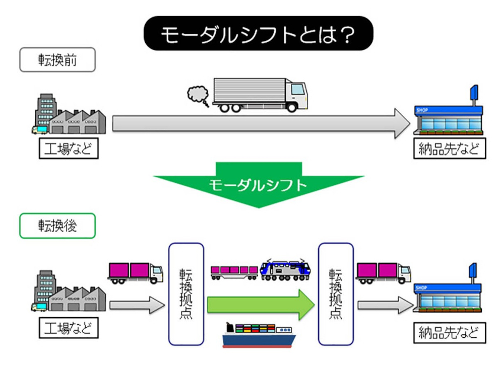 長年、日本国内における貨物輸送の中心はトラック等の自動車であり、例えば、2023年度の輸送量ではトンベース(※1)で90%以上、トンキロベース(※2)で約50%を自動車が占めています。しかし、近年はトラックドライバー不足をはじめ、カーボンニュートラルの実現などの課題があり、その解決のために一度に大量の荷物を輸送でき、CO₂の排出量がより少ない鉄道、船への切り替えが進められています。これを「モーダルシフト」といいます(図参照)。
