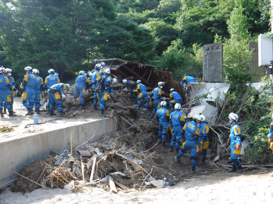 平成30年7月豪雨の災害現場。向かって右上に、1907年に起こった洪水・土石流を伝える伝承碑がある(提供:大阪府警察)。