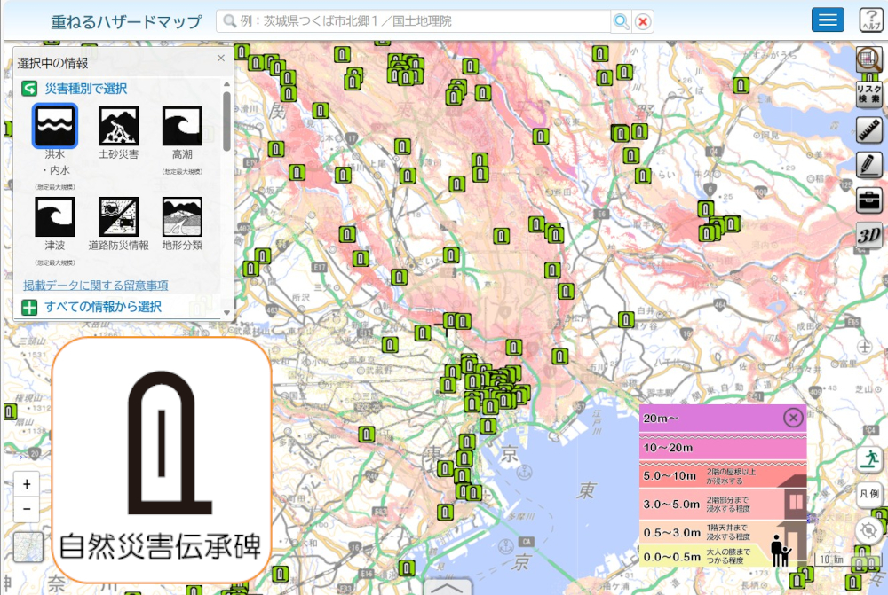 国土交通省水管理・国土保全局と国土地理院では、伝承碑の情報とハザードマップで使用される災害リスク情報とを組み合わせた地図(重ねるハザードマップ)を用意しています。災害リスク情報と伝承碑の内容を照らし合わせることで、今後その地域でどんな災害が起こる可能性があるのかをイメージできますから、地域住民の危機意識を高め、防災・減災活動を浸透させる上で役立つはず。万一の場合にも、適切な避難行動を期待できるようになるでしょう。