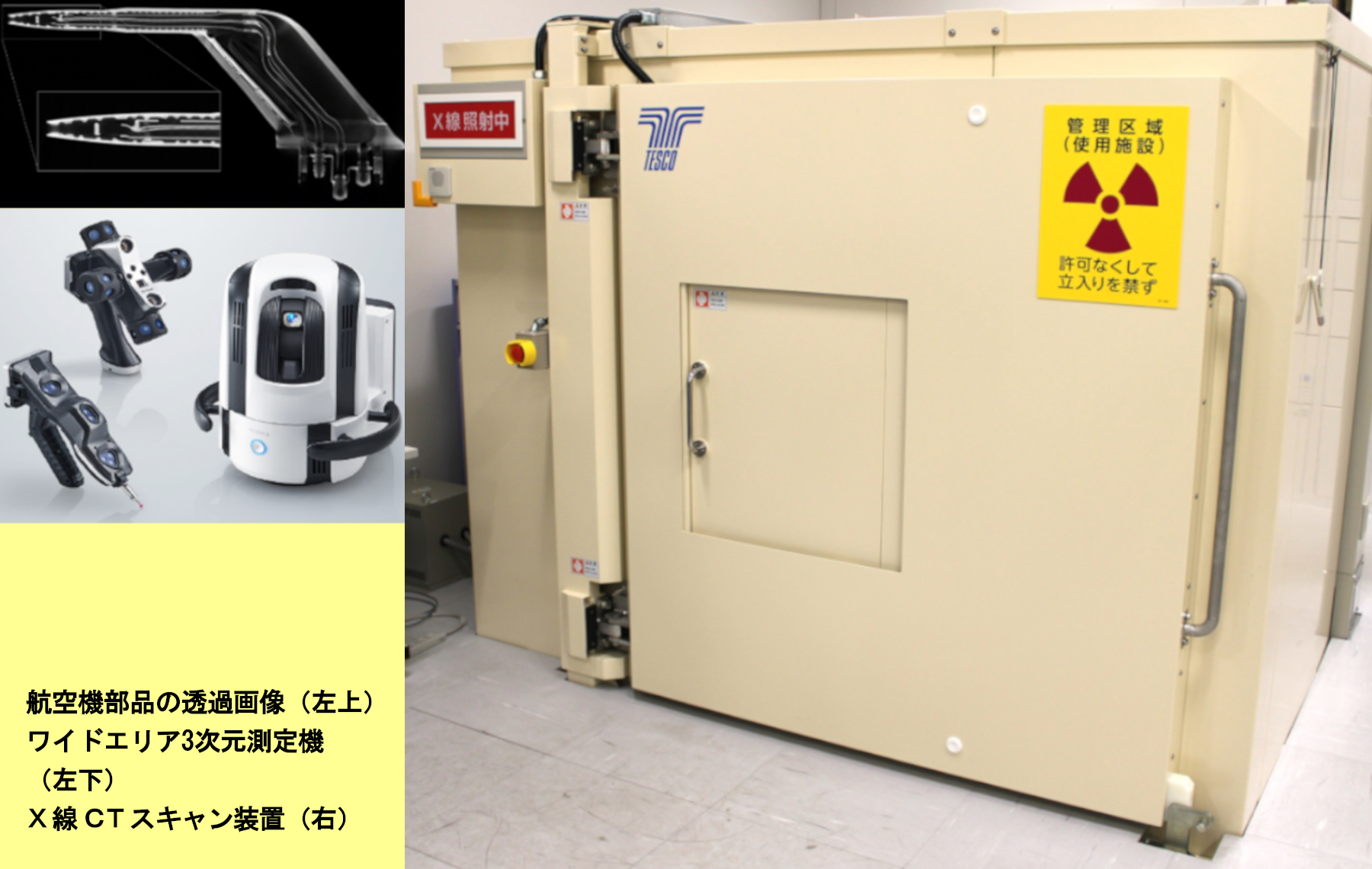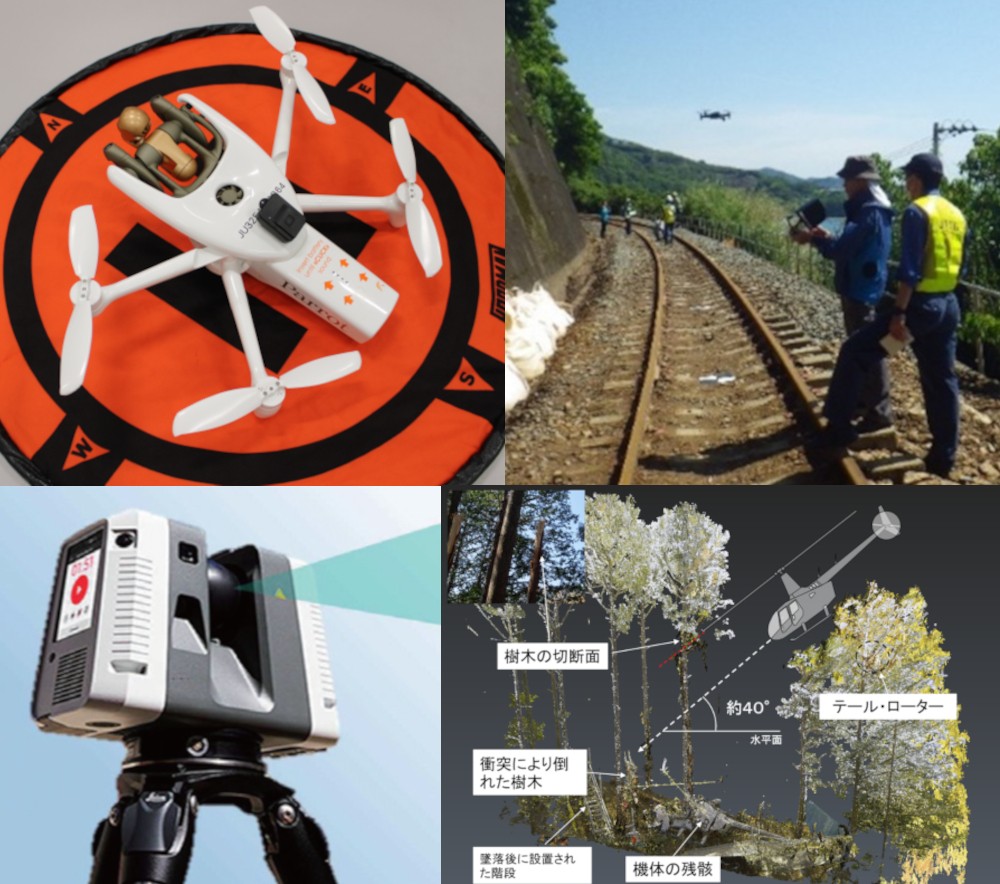 ドローン(左上)、現場調査でのドローンの飛行(右上)、3Dスキャン装置(左下)事故現場の3Dモデルよる事故状況の分析(右下)