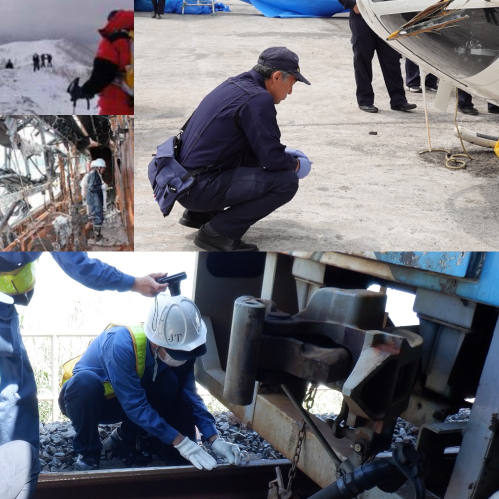 墜落事故の現場へ向かう調査官(左上)、船舶の火災事故の調査(左中)、航空事故の調査(右上)、脱線事故の調査(下)