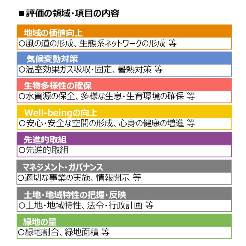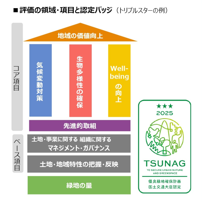 都市緑地法に基づき、民間事業者等による良質な緑地確保の取組を、国土交通大臣が評価・認定する制度です。評価は「気候変動対策」「生物多様性の確保」「Well-beingの向上」などの「質」と、緑地の「量」(緑地面積、緑地割合等)の両面から行い、評価が高いものから順にトリプル・スター、ダブル・スター、シングル・スターとランク付けされます。質に関する評価項目は、「緑地確保指針」に基づき50項目を設定し、一定基準を満たす計画を認定します。また、量に関しては、敷地面積の10%以上、かつ1000㎡以上(2027年度より500㎡以上)が認定対象となっています。