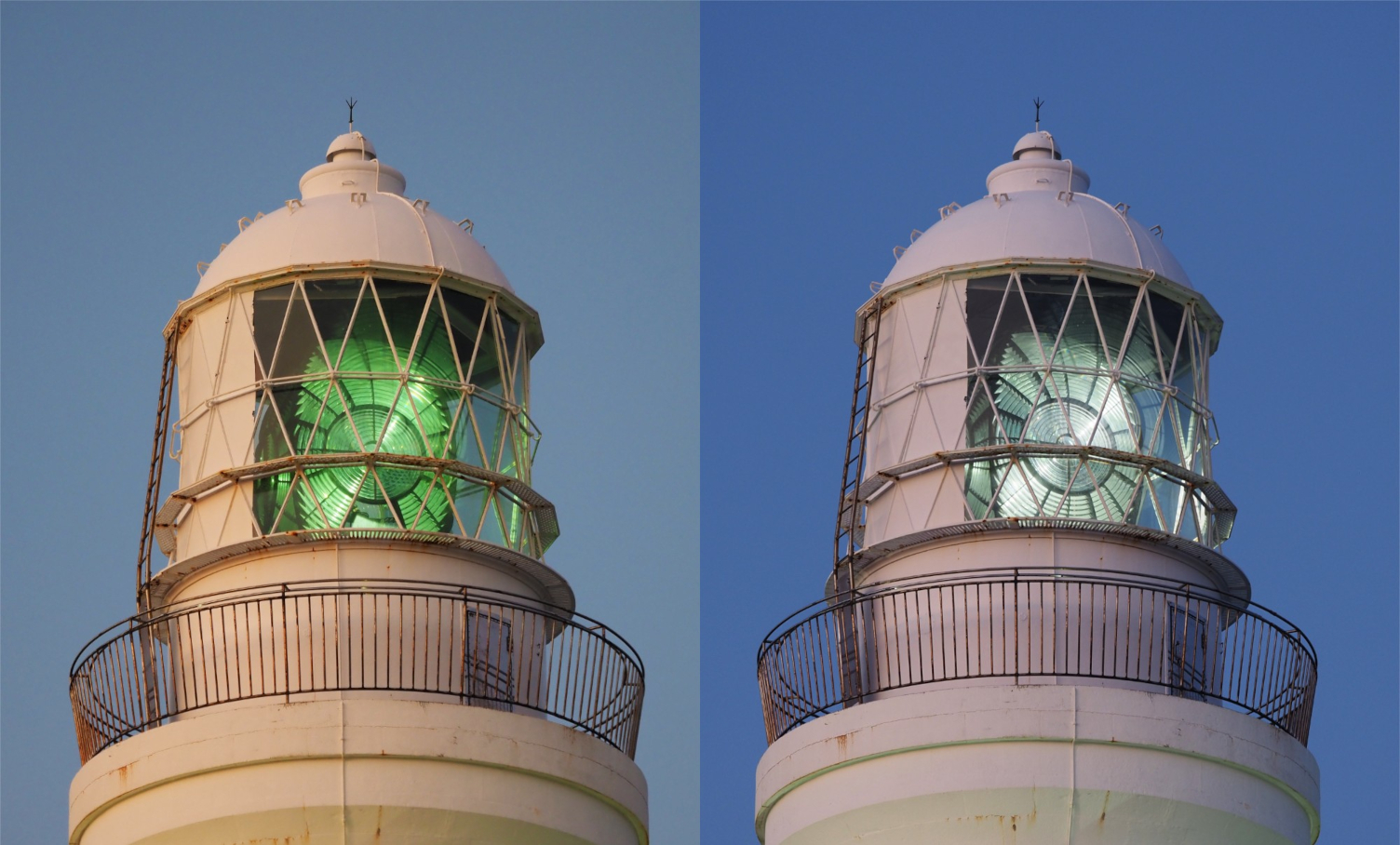 また、フレネルレンズ、それもメタルハライド電球(※1)を使っている灯台だと、点灯しはじめてから数分間は、光が鮮やかな緑色に見えるんですね。私はそれを「エメラルドタイム」と名付け、この言葉は灯台ファンの間で定着しています。徐々に温度が上がるにつれて真っ白な眩い光に変わり、今度は「ダイヤモンドタイム」です。特に回転するタイプのレンズ(※2)なら光がグルグルと勢い良く回り、「今まさに灯台が目覚めた」という感じで胸が高鳴ります。エメラルドタイムはフレネルレンズを使用している灯台で見ることができますが、メタルハライド電球はもう生産されていません。次々にLED化されているので、もうすぐ見納めになるかも…。見てみたい方はぜひお急ぎください。