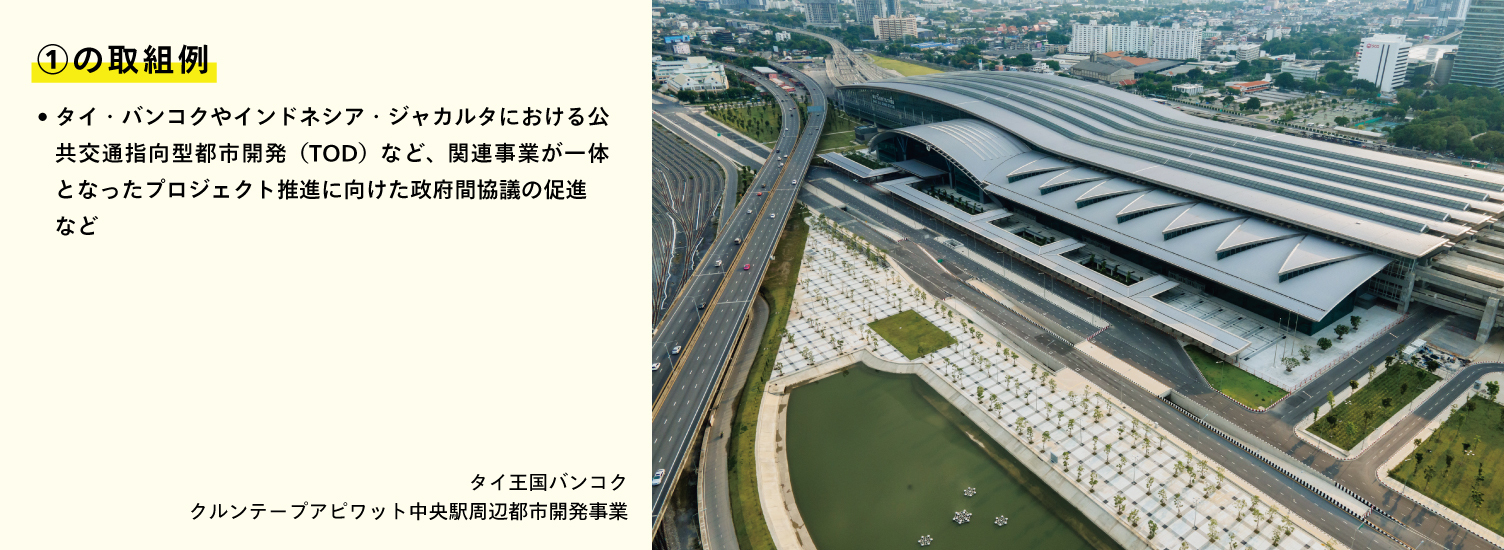 急速に経済発展した途上国や新興国では、都市部と郊外を結ぶ鉄道ができても、都市部の交通網が整備されずに交通渋滞が常態化する光景も見られます。また、郊外の駅周辺の開発も未着手のことが多く、それらを相手国の課題解決に資する形で総合的に開発する公共交通施行型都市開発(TOD)も共創に基づく取組の一つと考えています。