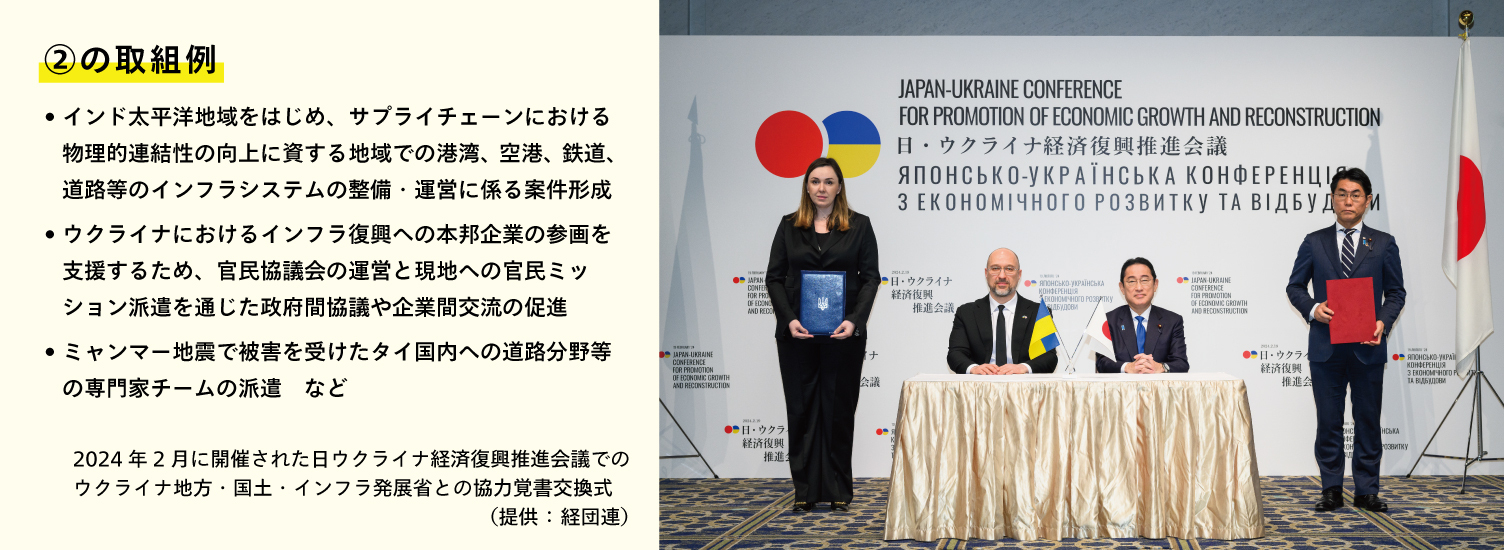 ①は日本から相手国に情報や技術を提供するだけでなく、相手国から学んだ内容を日本国内の市場に活かす、相手国に寄り添って共に作り上げていく共創の観点です。さらに国際競争力の強化のため、PPP事業も含む相手国の案件に日本企業が参画できるよう日本側から積極的にアプローチするといった取組も重視しています。