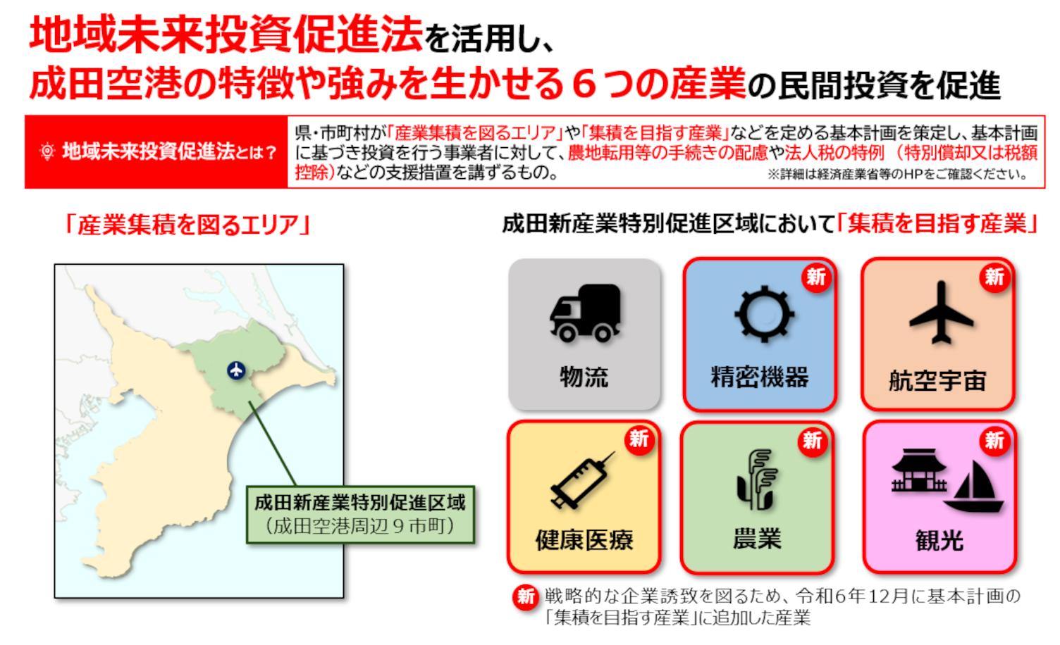 成田空港周辺では、物流のほか、空港の特徴や強みを生かせる航空宇宙・精密機器・健康医療・農業・観光の5分野の企業を積極的に誘致し、集積を進めていきます。