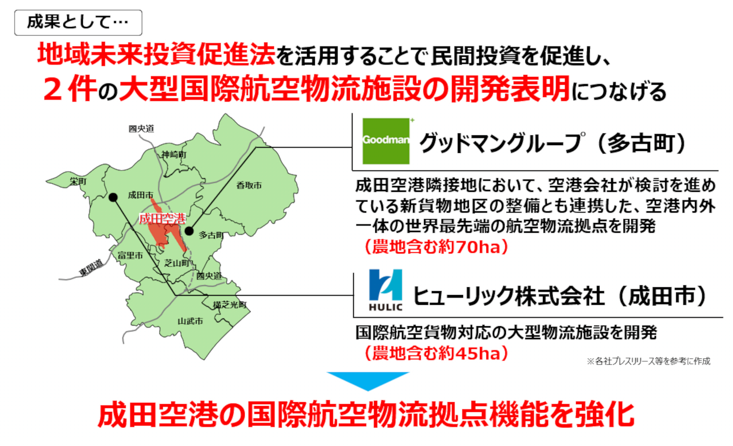 これにより、成田空港周辺のインター近くの土地など、いわゆる「交通結節点」の周辺において、空港の機能と一体的運用が必要な物流施設を整備する場合は、農用地区域であっても柔軟かつ弾力的な開発が可能になったわけです。